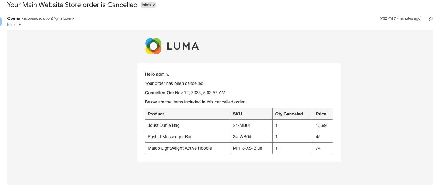 Contact UsElevate your e-commerce game with our Cancel Order Email Notification Extension for Magento 2. Seamlessly bridge the communication gap between admin and customers by sending cancellation confirmation emails. Our user-friendly extension empowers you to enhance the shopping experience, while customizable templates, easy installation, and harmonious integration ensure a smooth process. Foster transparency, trust, and loyalty with timely notifications, demonstrating your commitment to customer satisfaction. Elevate your store's communication strategy – get the Cancel Order Email Notification Extension today and redefine the way you connect with your customers.