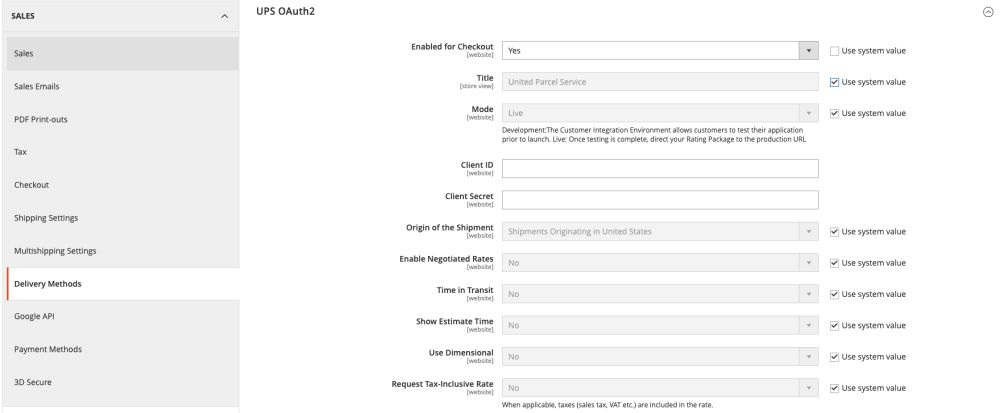Log in to the Admin Magento. Navigate to Stores > Configuration. Navigate to Sales > Delivery Methods > UPS OAuth2.